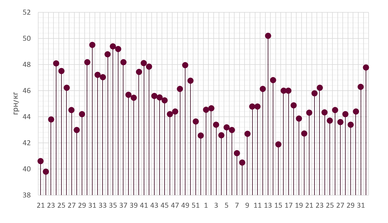 Факт: ціни на свинину демонструють приріст упродовж трьох останніх тижнів. Так, у ході попередніх торгів виробники свинини «розписали» товарні партії на 1-2 грн/кг дорожче. Тож цьоготижневий нижній поріг цін перевищив середню позначку кінця липня (46,5 грн/кг), а ціновий максимум зупинився на рівні 48,5 грн/кг. Основним чинником підтримки цін наразі слугує сезонна обмеженість товарних партій та менша середня забійна маса тварин.